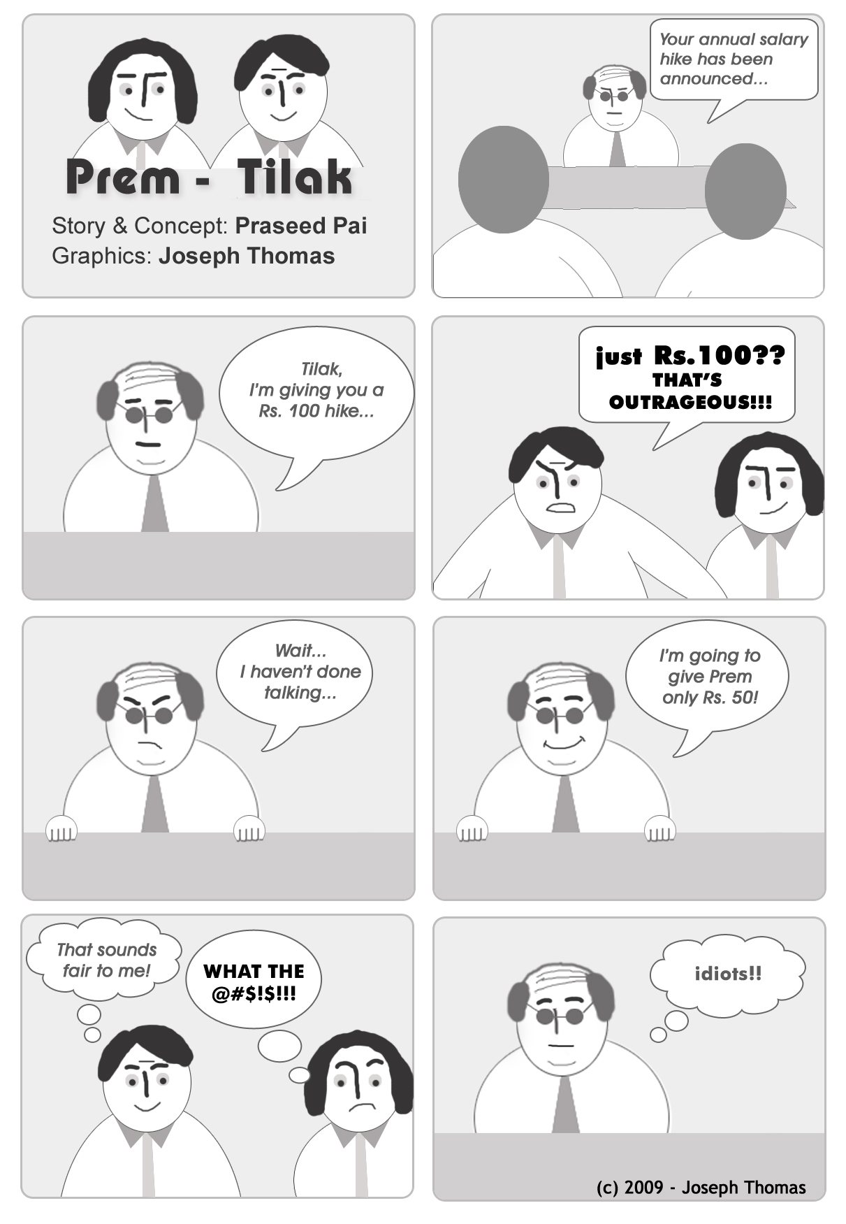 The Prem-Tilak stories were born out of one such chat session, when we talked about two of our ex-colleagues. Pai started writing the first story right away and I found it to be witty after reading it. Pai kept on writing and I told him that one day I would try sketching it as a comic strip. So on an evening in the last week, I did the first strip of the Prem-Tilak series. I will do more as I find time and energy. I did not spend a lot of time for this one, so it may not be all so perfect. And I had to draw it in Photoshop using mouse as there is no other digital drawing tool available with me.